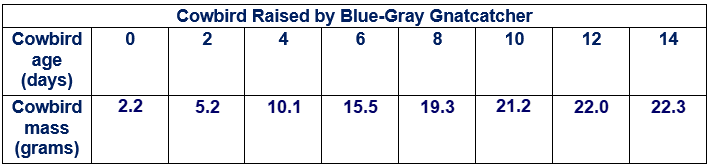 The brown-headed cowbird does not raise its own offspring. It lays eggs in the nests of other bird species, which then hatch the eggs and raise the young. A scientist investigated whether the growth of a young cowbird is affected by the species of bird that raises it. The scientist’s results for two bird species are shown below.