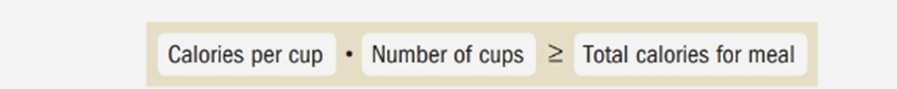 While training for a marathon, you try to consume at least calories each day. For one meal, you like to eat at least calories. You choose to eat pasta that has calories per cup.