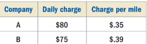 The table below shows the cost of renting a moving van for one day from two companies. The daily charge and the charge per mile shown below: