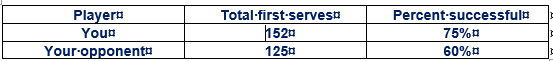 In tennis, you can serve the ball a second time if your first serve is not successful. The table shows the first serves by you and your opponent in a match. How many more successful first serves did you have than did your opponent?