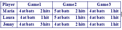 Extended Problem Solving The table shows the number of at bats and hits that players on a softball team had in three games.