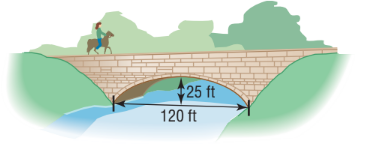 Parabolic Arch Bridge - A bridge is built in the shape of a parabolic arch. The bridge has a span of 120 feet and a maximum height of 25 feet. See the illustration. Choose a suitable rectangular coordinate system and find the height of the arch at distances of 10, 30, and 50 feet from the center.