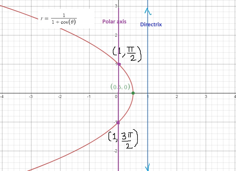 The directrix is perpendicular to the polar axis at a distance 1 units right side of the pole; the axis of symmetry is perpendicular to the polar axis.