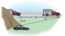 A state trooper is hidden 30 feet from a highway. One second after a truck passes, the angle between the highway and the line of observation from the patrol car to the truck is measured. See the illustration.