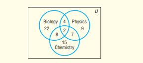 A survey of 70 college freshmen asked whether students planned to take biology, chemistry, or physics during their first year. Use the diagram to answer each question.