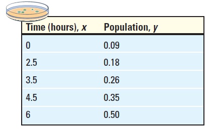 A strain of E. coli Beu 397-recA441 is placed into a nutrient broth at 30° Celsius and allowed to grow. The following data are collected. Theory states that the number of bacteria in the petri dish will initially grow according to