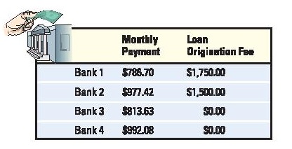 origination fee. Bank 4 will lend you $100,000 at the rate of 8.625% amortized over 15 years with no loan origination fee. Which loan would you take? Why? Be sure to have sound reasons for your choice. Use the information in the table to assist you. If the amount of the monthly payment does not matter to you, which loan would you take? Again, have sound reasons for your choice. Compare your final decision with others in the class. Discuss.