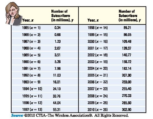 Cell Phone Subscribers The following data represent the number of cell phone subscribers in the United States from 1985 through 2010.