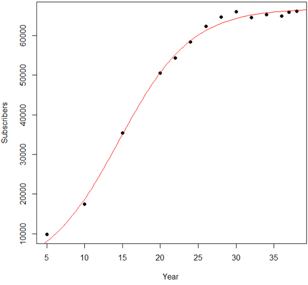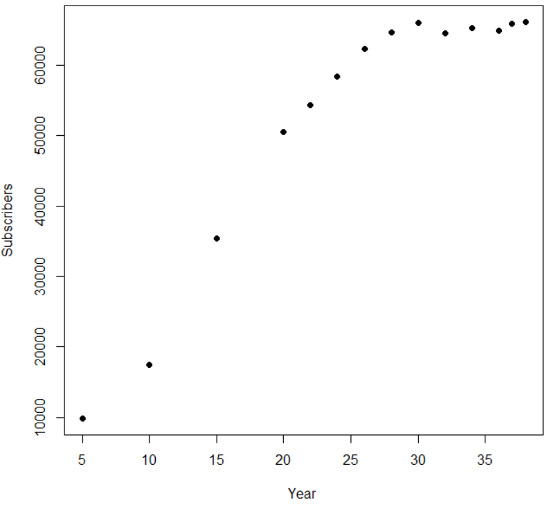 (a) Using a graphing utility, draw a scatter diagram of the data using the number of years after 1970, t, as the independent variable and number of subscribers as the dependent variable.