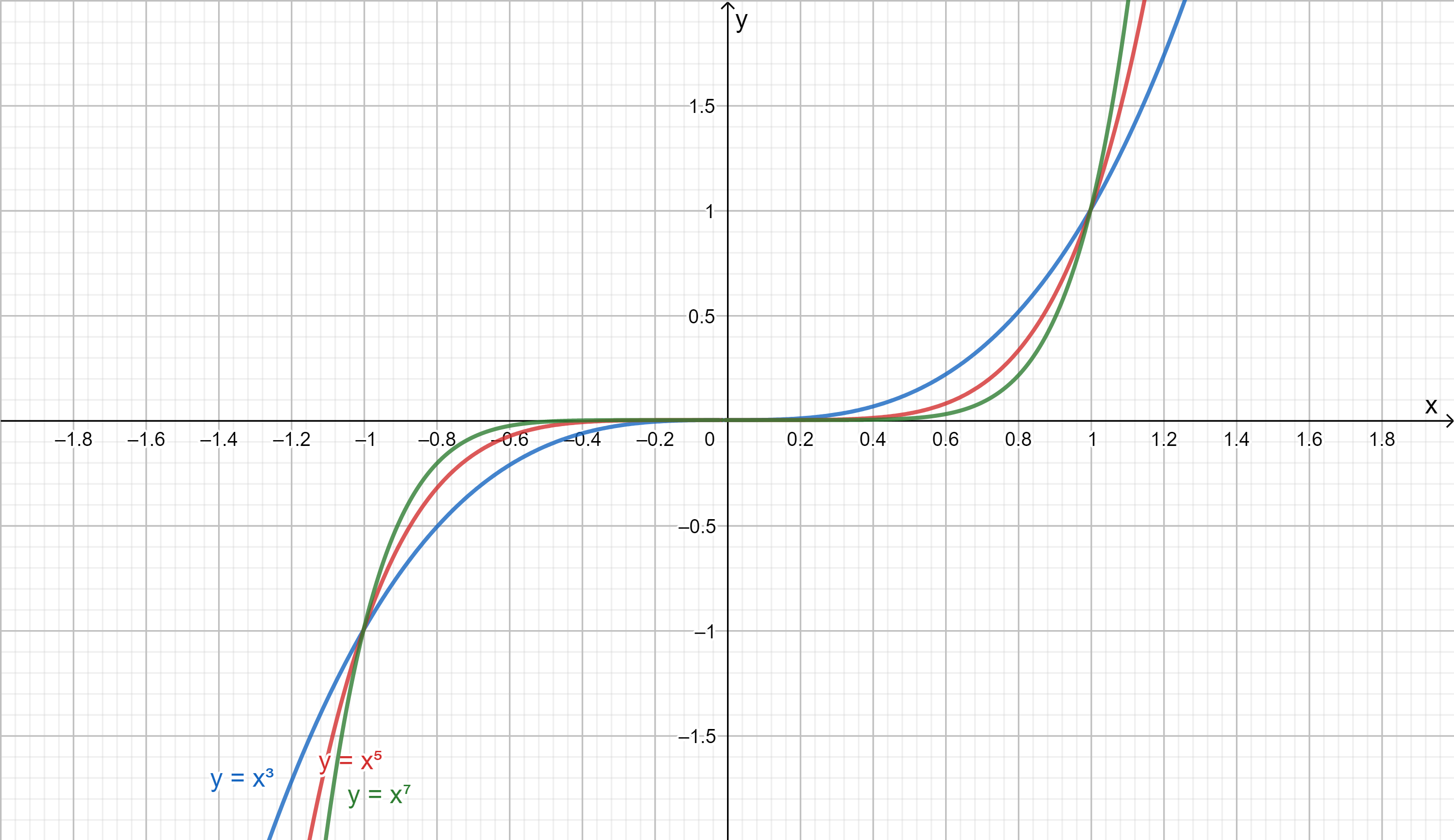 All three graphs have the same general shape and go through the points and . As the exponent increases, the steepness of the curve increases.
