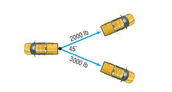 Truck Pull At a county fair truck pull, two pickup trucks are attached to the back end of a monster truck as illustrated in the figure. One of the pickups pulls with a force of pounds and the other pulls with a force of pounds with an angle of between them. With how much force must the monster truck pull in order to remain unmoved?