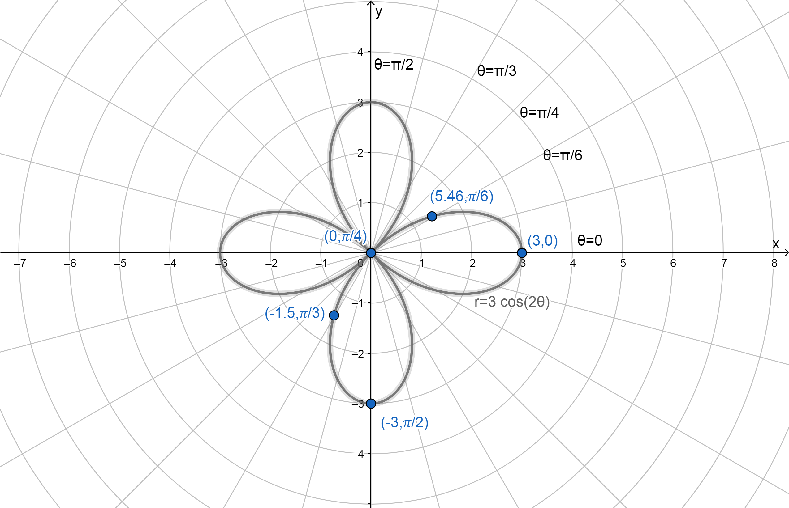 The equation is a rose with four petals and the graph is