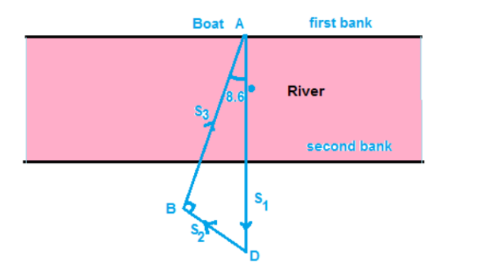 Correct Direction for Crossing a River A river has a constant current of . At what angle to a boat dock should a motorboat capable of maintaining a constant speed of be headed in order to reach a point directly opposite the dock? If the river is kilometer wide, how long will it take to cross?
