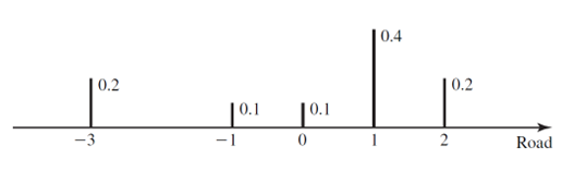 Suppose that a fire can occur at any one of five points along the road. These points are located at -3, -1, 0, 1, and 2 in Fig. 4.9. Suppose also that the probability that each of these points will be the location of the next fire that occurs along the road is as specified in Fig. 4.9.