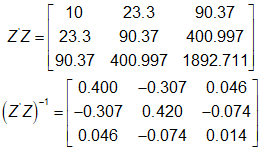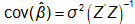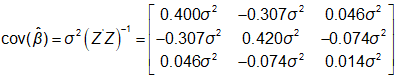 \(\begin{array}{*{20}{c}}{Var\left( {{{\hat \beta }_0}} \right) = 0.400{\sigma ^2},Var\left( {{{\hat \beta }_1}} \right) = 0.420{\sigma ^2},Var\left( {{{\hat \beta }_2}} \right) = 0.014{\sigma ^2}}\\{{\mathop{\rm cov}} \left( {{{\hat \beta }_0},{{\hat \beta }_1}} \right) = - 0.307{\sigma ^2},{\mathop{\rm cov}} \left( {{{\hat \beta }_0},{{\hat \beta }_2}} \right) = 0.046{\sigma ^2},{\mathop{\rm cov}} \left( {{{\hat \beta }_1},{{\hat \beta }_2}} \right) = - 0.074{\sigma ^2}}\end{array}\)