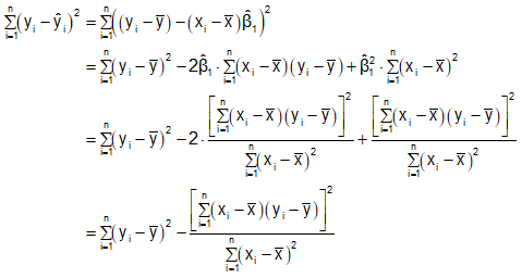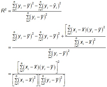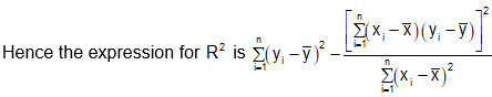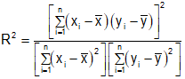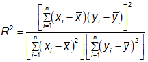 \({{\bf{R}}^{\bf{2}}}{\bf{ = }}\frac{{{{\left( {\mathop {\sum {\left( {{{\bf{x}}_{\bf{i}}}{\bf{ - \bar x}}} \right)\left( {{{\bf{y}}_{\bf{i}}}{\bf{ - \bar y}}} \right)} }\limits_{{\bf{i = 1}}}^{\bf{n}} } \right)}^{\bf{2}}}}}{{\left( {\mathop {\sum {{{\left( {{{\bf{x}}_{\bf{i}}}{\bf{ - \bar x}}} \right)}^{\bf{2}}}} }\limits_{{\bf{i = 1}}}^{\bf{n}} } \right)\left( {\mathop {\sum {{{\left( {{{\bf{y}}_{\bf{i}}}{\bf{ - \bar y}}} \right)}^{\bf{2}}}} }\limits_{{\bf{i = 1}}}^{\bf{n}} } \right)}}\)