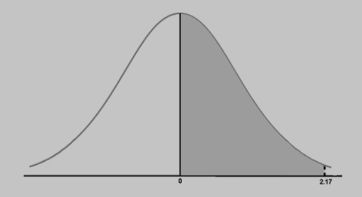 \(\begin{array}{*{20}{c}}{{\rm{f(0) = 0}}{\rm{.5}}}\\{{\rm{P(0£ Z£ 2}}{\rm{.17) = f(2}}{\rm{.17) - f(0)}}}\\{{\rm{ = 0}}{\rm{.9850 - 0}}{\rm{.5}}}\\{{\rm{P(0£ Z£ 2}}{\rm{.17) = 0}}{\rm{.4850}}}\end{array}\)