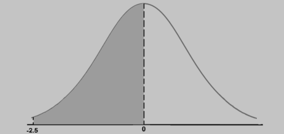 (c) \({\rm{P( - 2}}{\rm{.5£ Z£ 0)}}\): The area beneath the standard normal curve above the interval with the left endpoint \({\rm{ - 2}}{\rm{.5}}\) and the right endpoint \({\rm{0}}\). In the diagram below, this is the shaded area. Thus