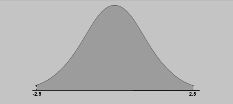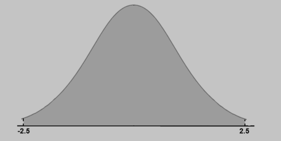 (d) \({\rm{P( - 2}}{\rm{.5£ Z£ 2}}{\rm{.5)}}\): The area beneath the standard normal curve above the interval with the left endpoint \({\rm{ - 2}}{\rm{.5}}\) and the right endpoint \({\rm{2}}{\rm{.5}}\). In the diagram below, this is the shaded area. Thus
