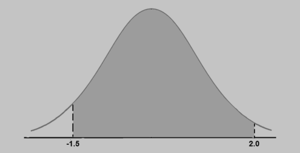 (g) \({\rm{P( - 1}}{\rm{.5£ Z£ 2)}}\): The area under the standard normal curve above the interval with the left endpoint of \({\rm{ - 1}}{\rm{.5}}\)and the right endpoint is \({\rm{2}}\). In the diagram below, this is the shaded area. Thus