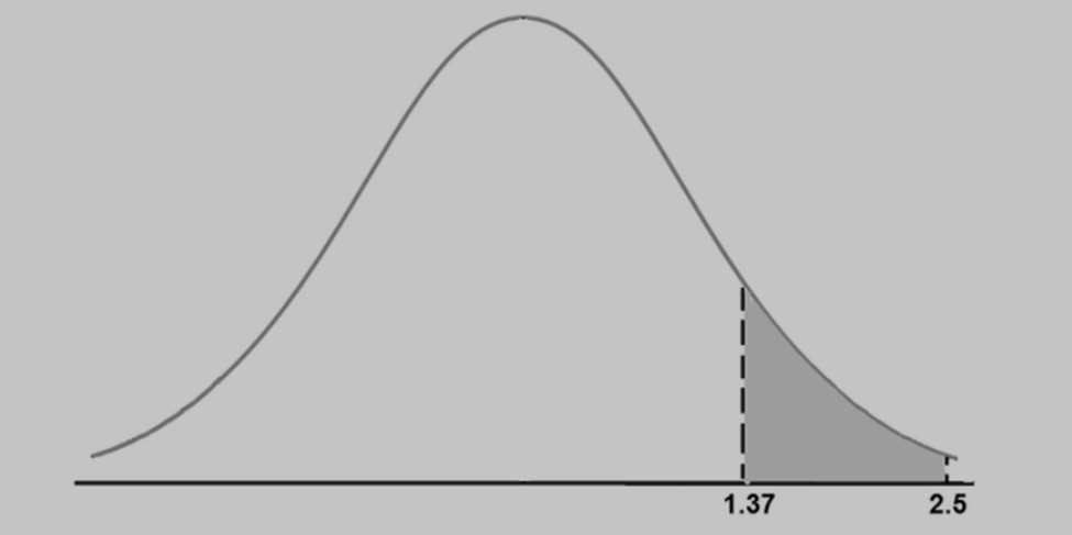 (h) \({\rm{P(1}}{\rm{.37£ Z£ 2}}{\rm{.5)}}\): The area under the standard normal curve above the interval with the left endpoint of \({\rm{1}}{\rm{.37}}\)and the right end point is \({\rm{2}}{\rm{.5}}\). In the diagram below, this is the shaded area. Thus