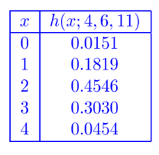 \(\begin{array}{c}{\rm{h(x;4,6,11) = P(X = x)}}\\{\rm{ = }}\frac{{\left( {\begin{array}{*{20}{c}}{\rm{6}}\\{\rm{x}}\end{array}} \right)\left( {\begin{array}{*{20}{c}}{{\rm{11 - 6}}}\\{{\rm{4 - x}}}\end{array}} \right)}}{{\left( {\begin{array}{*{20}{c}}{{\rm{11}}}\\{\rm{4}}\end{array}} \right)}}\end{array}\)