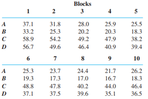 In a test to determine whether soil pretreated with small amounts of Basic-H makes the soil more permeable to water, soil samples were divided into blocks, and each block received each of the four treatments under study. The treatments were (A) water with .001% Basic-H flooded on control soil, (B) water without Basic-H on control soil, (C) water with Basic-H flooded on soil pretreated with Basic-H, and (D) water without Basic-H on soil pretreated with Basic-H. Test at level .01 to see whether there are any effects due to the different treatments.
