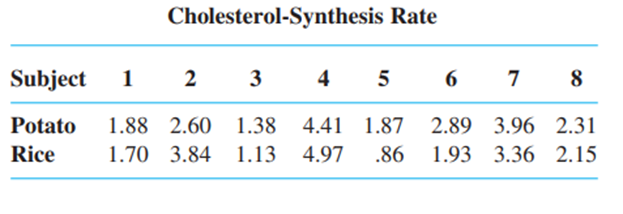 The article 鈥淓ffects of a Rice-Rich Versus Potato-Rich Diet on Glucose, Lipoprotein, and Cholesterol Metabolism in Noninsulin-Dependent Diabetics鈥 (Amer. J. of Clinical Nutr., 1984: 598鈥606) gives the accompanying data on cholesterol synthesis rate for eight diabetic subjects. Subjects were fed a standardized diet with potato or rice as the major carbohydrate source. Participants received both diets for specified periods of time, with cholesterol-synthesis rate (mmol/day) measured at the end of each dietary period. The analysis presented in this article used a distribution-free test. Use such a test with significance level .05 to determine whether the true mean cholesterol-synthesis rate differs significantly for the two sources of carbohydrates.