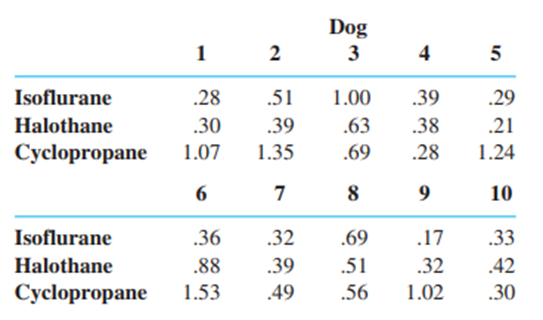 In an experiment to study the way in which different anesthetics affect plasma epinephrine concentration, ten dogs were selected and concentration was measured while they were under the influence of the anesthetics isoflurane, halothane, and cyclopropane (鈥淪ympathoadrenal and Hemodynamic Effects of Isoflurane, Halothane, and Cyclopropane in Dogs,鈥 Anesthesiology, 1974: 465鈥470). Test at level .05 to see whether there is an anesthetic effect on concentration