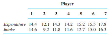 How does energy intake compare to energy expenditure? One aspect of this issue was considered in the article 鈥淢easurement of Total Energy Expenditure by the Doubly Labelled Water Method in Professional Soccer Players鈥 (J. of Sports Sciences, 2002: 391鈥397), which contained the accompanying data (MJ/day).
