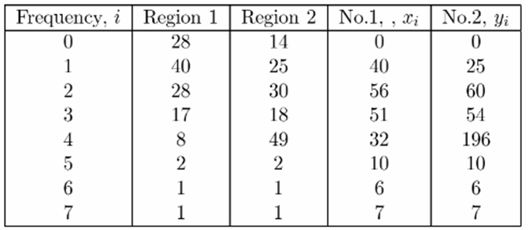 Let \({X_L},....,{X_m}\)be a random sample from a Poisson distribution with parameter\({\mu _1}\), and let \({Y_1},....,{Y_n}\)be a random sample from another Poisson distribution with parameter\({\mu _2}\). We wish to test \({H_0}:{\mu _1} - {\mu _2} = 0\) against one of the three standard alternatives. When m and n are large, the large-sample z test of Section 9.1 can be used. However, the fact that \(V(\bar X) = \mu /n\) suggests that a different denominator should be used in standardizing\(\bar X - \bar Y\). Develop a large sample test procedure appropriate to this problem, and then apply it to the following data to test whether the plant densities for a particular species are equal in two different regions (where each observation is the number of plants found in a randomly located square sampling quadrate having area\(1\;{m^2}\), so for region 1 there were 40 quadrates in which one plant was observed, etc.):