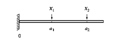 If two loads are applied to a cantilever beam as shown in the accompanying drawing, the bending moment at \({\rm{0}}\) due to the loads is \({{\rm{a}}_{\rm{1}}}{{\rm{X}}_{\rm{1}}}{\rm{ + }}{{\rm{a}}_{\rm{2}}}{{\rm{X}}_{\rm{2}}}{\rm{ }}\)