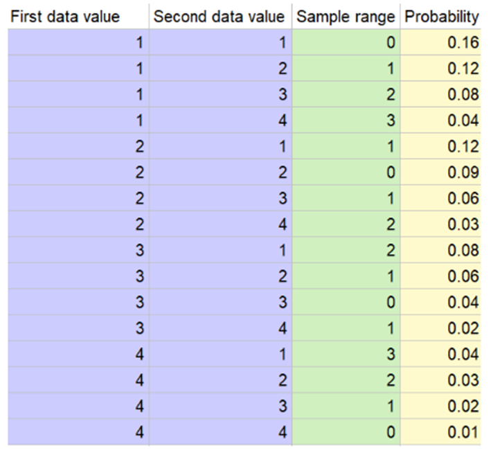 c. Again consider a random sample of size\({\rm{n = 2}}\), but now focus on the statistic \({\rm{R = }}\) the sample range (difference between the largest and smallest values in the sample). Obtain the distribution of\({\rm{R}}\). (Hint: Calculate the value of \({\rm{R}}\) for each outcome and use the probabilities from part (a).)