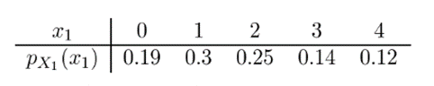 \(\begin{aligned}{\rm{E}}\left( {{{\rm{X}}_{\rm{1}}}} \right){\rm{ = 0 \times }}{{\rm{p}}_{{{\rm{X}}_{\rm{1}}}}}{\rm{(0) + 1 \times }}{{\rm{p}}_{{{\rm{X}}_{\rm{1}}}}}{\rm{(1) + 2 \times }}{{\rm{p}}_{{{\rm{X}}_{\rm{1}}}}}{\rm{(2) + 3 \times }}{{\rm{p}}_{{{\rm{X}}_{\rm{1}}}}}{\rm{(3) + 4 \times }}{{\rm{p}}_{{{\rm{X}}_{\rm{1}}}}}{\rm{(4)}}\\{\rm{ = 0 \times 0}}{\rm{.19 + 1 \times 0}}{\rm{.3 + 2 \times 0}}{\rm{.25 + 3 \times 0}}{\rm{.14 + 4 \times 0}}{\rm{.12}}\\{\rm{ = 0 + 0}}{\rm{.3 + 0}}{\rm{.5 + 0}}{\rm{.42 + 0}}{\rm{.48}}\\{\rm{ = 1}}{\rm{.7}}\end{aligned}\)