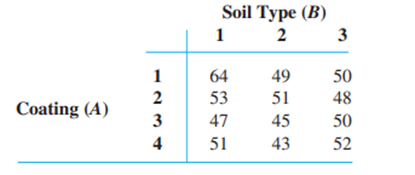Four different coatings are being considered for corrosion protection of metal pipe. The pipe will be buried in three different types of soil. To investigate whether the amount of corrosion depends either on the coating or on the type of soil, 12 pieces of pipe are selected. Each piece is coated with one of the four coatings and buried in one of the three types of soil for a fixed time, after which the amount of corrosion (depth of maximum pits, in .0001 in.) is determined. The data appears in the table.
