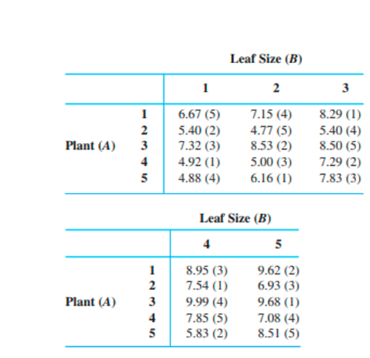 The article 鈥淰ariation in Moisture and Ascorbic Acid Content from Leaf to Leaf and Plant to Plant in Turnip Greens鈥 (Southern Cooperative Services Bull., 1951: 13鈥17) uses a Latin square design in which factor A is plant, factor B is leaf size (smallest to largest), factor C (in parentheses) is time of weighing, and the response variable is moisture content.