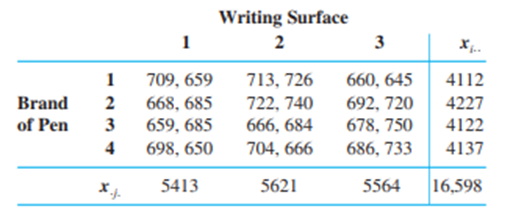 A study was carried out to compare the writing lifetimes of four premium brands of pens. It was thought that the writing surface might affect lifetime, so three different surfaces were randomly selected. A writing machine was used to ensure that conditions were otherwise homogeneous (e.g., constant pressure and a fixed angle). The accompanying table shows the two lifetimes (min) obtained for each brand-surface combination.