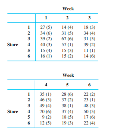 The article 鈥淭he Responsiveness of Food Sales to Shelf Space Requirements鈥 (J. Marketing Research, 1964: 63鈥67) reports the use of a Latin square design to investigate the effect of shelf space on food sales. The experiment was carried out over a 6-week period using six different stores, resulting in the following data on sales of powdered coffee cream (with shelf space index in parentheses):