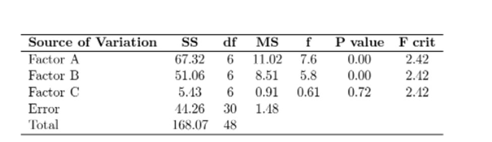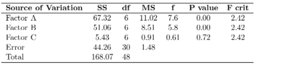 \(\begin{aligned}{*{20}{c}}{SSE = SST - (SSA + SSB + SSC)}\\{ = 168.07 - 67.32 - 51.06 - 5.43}\\{ = 44.26}\end{aligned}\)