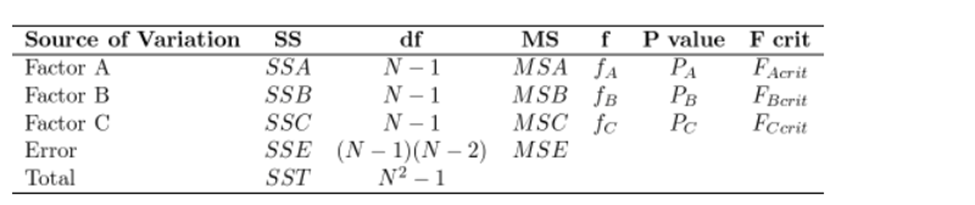 \(\begin{aligned}{*{20}{c}}{d{f_T} = {N^2} - 1 = 48}\\{d{f_A} = N - 1 = 6}\\{d{f_B} = N - 1 = 6}\\{d{f_C} = N - 1 = 6}\\{d{f_E} = (N - 1)(N - 2) = (7 - 1)(7 - 2) = 30}\end{aligned}\)