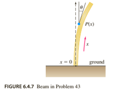 Column Bending Under Its Own Weight A uniform thin column of length \(L\), positioned vertically with one end embedded in the ground, will deflect, or bend away, from the vertical under the influence of its own weight when its length or height exceeds a certain critical value. It can be shown that the angular deflection \(\theta (x)\) of the column from the vertical at a point \(P(x)\) is a solution of the boundary-value problem:\(El\frac{{{d^2}\theta }}{{d{x^2}}} + \delta g(L - x)\theta = 0,\theta (0) = 0,\theta '(L) = 0,\) where \(E\) is Young’s modulus, \(I\) is the cross-sectional moment of inertia, \(\delta \) is the constant linear density, and \(x\) is the distance along the column measured from its base. See Figure 6.4.7. The column will bend only for those values of \(L\) for which the boundary-value problem has a nontrivial solution.