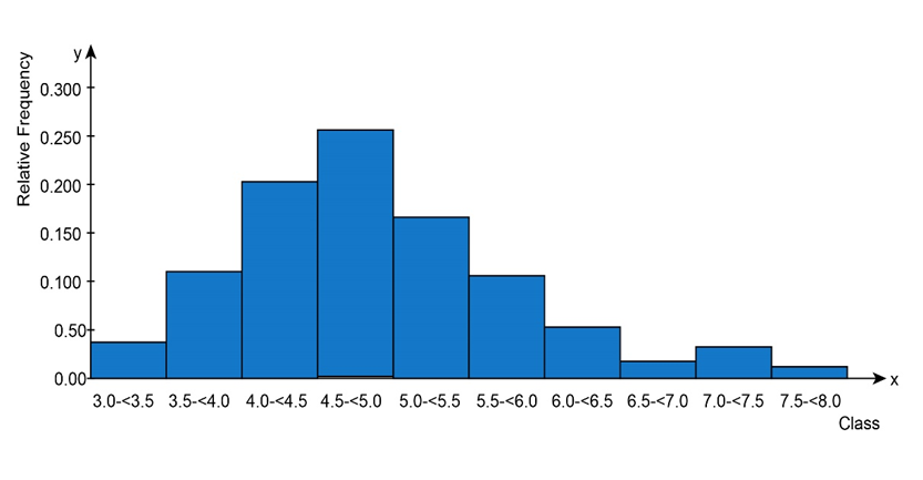 c. Construct a histogram with relative frequency on the vertical axis and comment on interesting features. In particular, does the distribution of particle sizes appear to be reasonably symmetric or somewhat skewed? (Note:The investigators fit lognormaldistribution to the data; this is discussed in Chapter 4.)