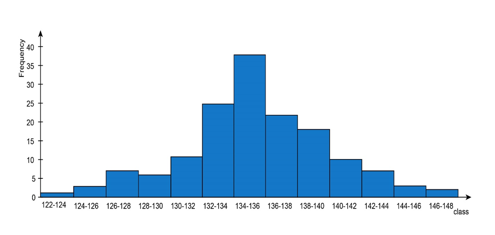 b. Construct a histogram using equal-width classes with the first class having a lower limit of 122 and an upper limit of 124. Then comment on any interesting features of the histogram.