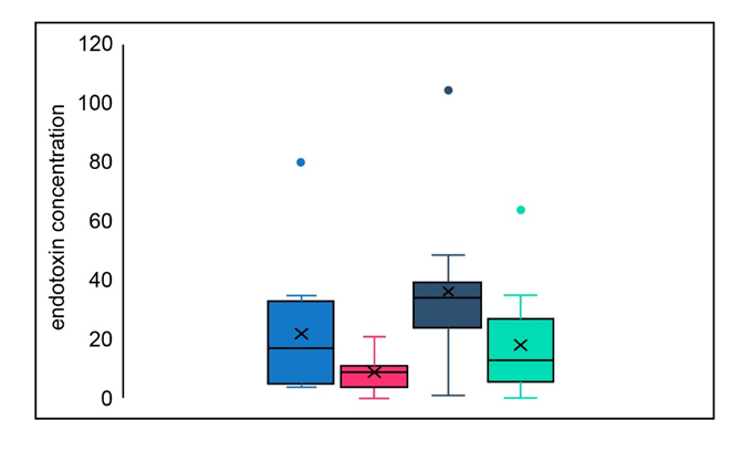 Where blue boxplot represents x, pink represents y, dark blue represents p and green represents q data.