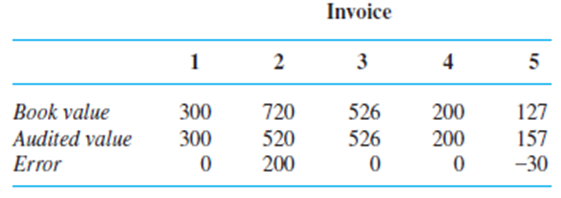 As an example of a situation in which several different statis tics could reasonably be used to calculate a point estimate, consider a population of N invoices. Associated with each invoice is its 鈥渂ook value,鈥 the recorded amount of that invoice. Let T denote the total book value, a known amount. Some of these book values are erroneous. An audit will be carried out by randomly selecting n invoices and determining the audited (correct) value for each one. Suppose that the sample gives the following