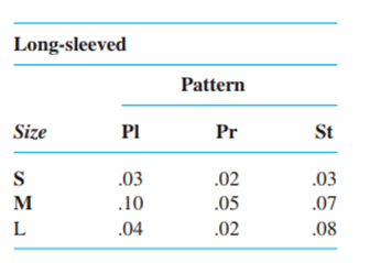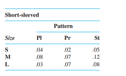 A department store sells sports shirts in three sizes (small, medium, and large), three patterns (plaid, print, and stripe), and two sleeve lengths (long and short). The accompanying tables give the proportions of shirts sold in the various category combinations.