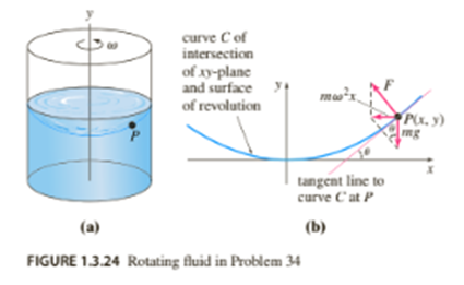 Rotating Fluid As shown in Figure 1.3.24(a), a right-circular cylinder partially filled with fluid is rotated with a constant angular velocity v about a vertical \(y - \)axis through its center. The rotating fluid forms a surface of revolution S. To identify S, we first establish a coordinate system consisting of a vertical plane determined by the \(y - \)axis and an \(x - \)axis drawn perpendicular to the \(y - \)axis such that the point of intersection of the axes (the origin) is located at the lowest point on the surface S. We then seek a function \(y = f(x)\) that represents the curve C of intersection of the surface S and the vertical coordinate plane. Let the point \(P(x,y)\) denote the position of a particle of the rotating fluid of mass m in the coordinate plane. See Figure 1.3.24(b).