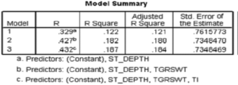 As a preliminary step in the construction of this model, the EPA used a stepwise regression procedure to identify the most important of these six variables. A total of 716 samples were taken at different stations in the gulf, producing the SPSS printout shown below. (The response measured was y, the logarithm of the number of marine animals found in the sampled area.)