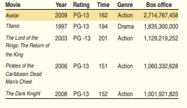 According to the Internet Movie Database, Avatar is tops based on box office sales worldwide. The following table displays data on several popular movies.