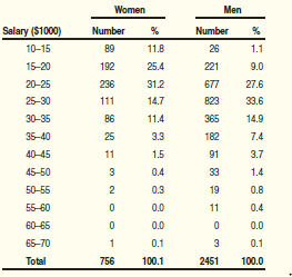 Who makes more? A manufacturing company is reviewing the salaries of its full-time employees below the executive level at a large plant. The clerical staff is almost entirely female, while a majority of the production workers and technical staff are male. As a result, the distributions of salaries for male and female employees may be quite different. The table below gives the frequencies and relative frequencies for women and men.